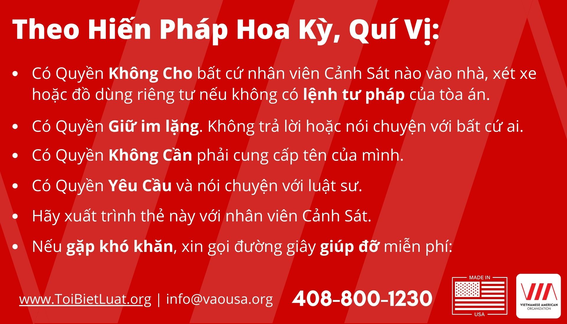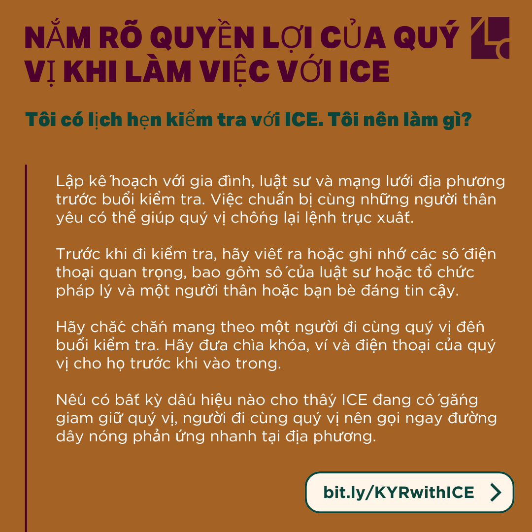 ➡️ Vì trong nhiều tình huống, biết quyền của bạn có thể giúp bảo vệ bản thân, người quen, và gia đình, đặc biệt khi tiếp xúc với ICE hoặc cơ quan công lực. Nếu bạn không biết quyền của mình, bạn có thể bị thiệt thòi hoặc bị lạm dụng quyền lực.